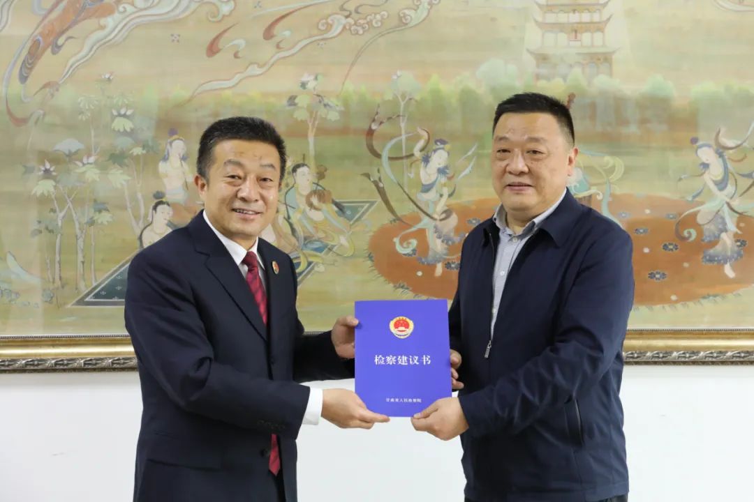 4月14日下午,甘肃省检察院党组成员、副检察长张学军就督促落实侵害未成年人强制报告制度(以下简称强制报告制度)问题,向省未成年人保护工作领导小组办公室(简称“省未保办”)送达检察建议书并座谈。省未保办常务副主任、省民政厅副厅长李剑代表省未保办接受检察建议书。
