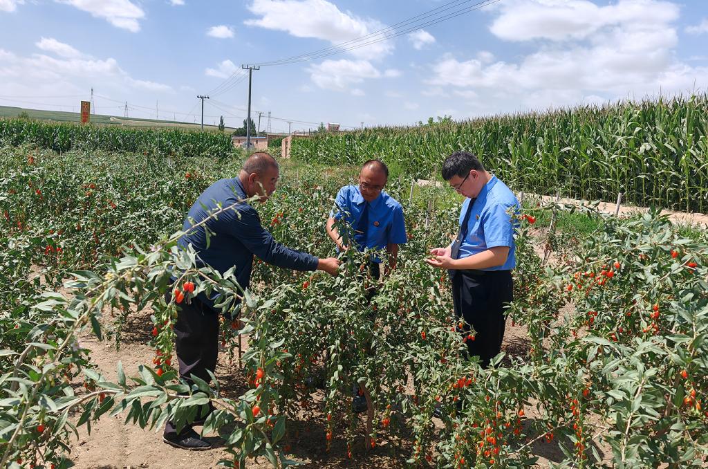 2024年7月,靖远县检察院干警在枸杞种植园调研走访,更好以司法服务护航枸杞产业发展。