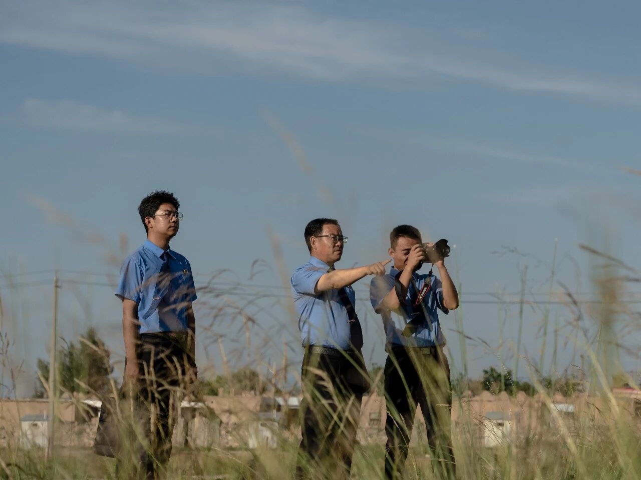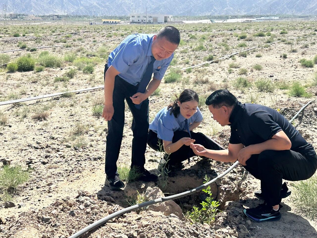2025年7月25日,肃北县检察院干警在该县“三北”工程林草湿荒一体化保护修复项目现场查看梭梭树种植情况。