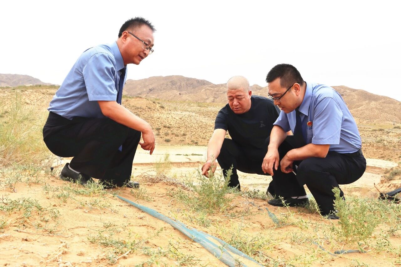 2023年8月,景泰县检察院干警实地查看被破坏沙化土地封禁保护区整改情况,发现沟渠已回填平整,开挖区域植被已重新种植且成活率显著提高。