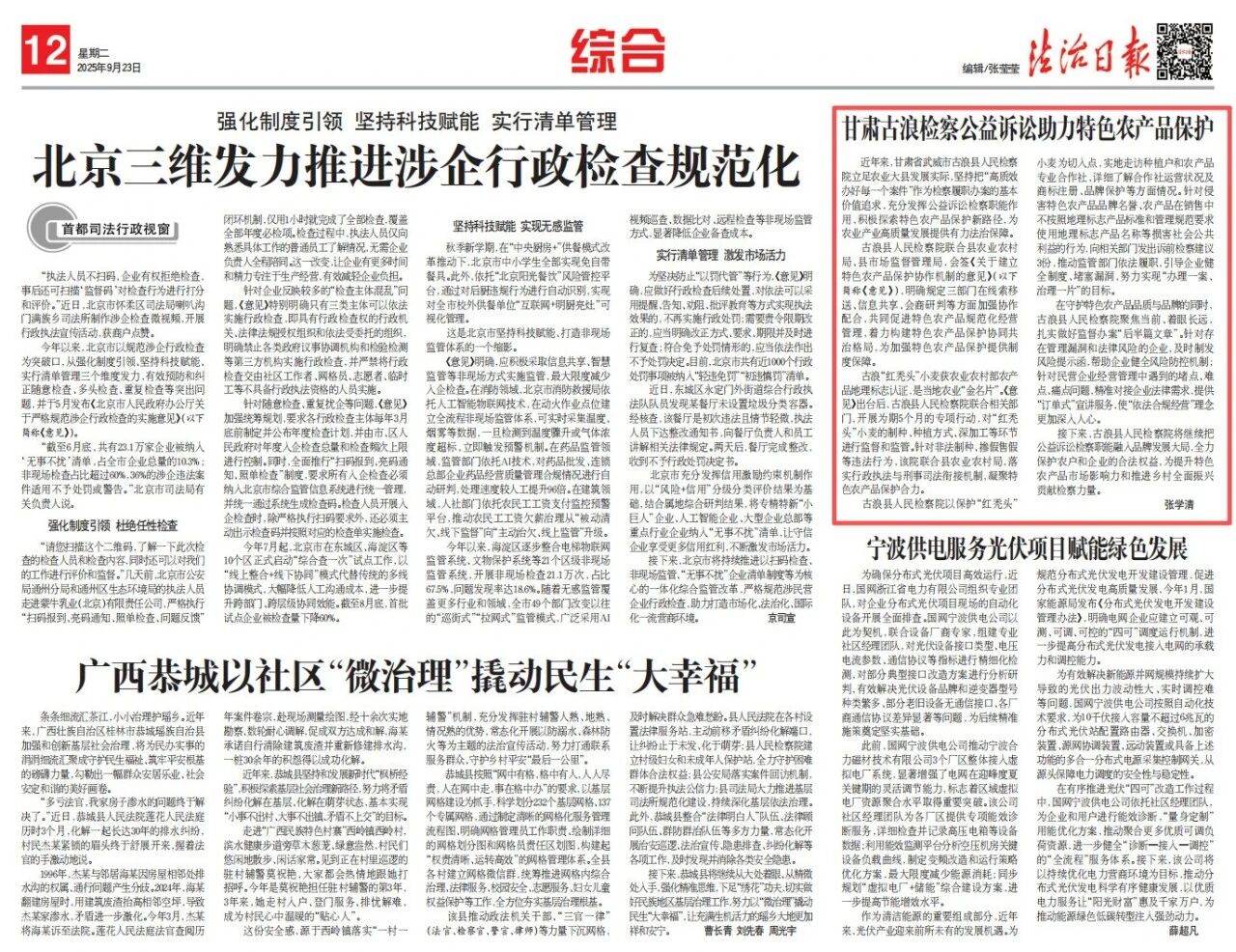 2025年9月23日,法治日报刊发《甘肃古浪检察公益诉讼助力特色农产品保护》。