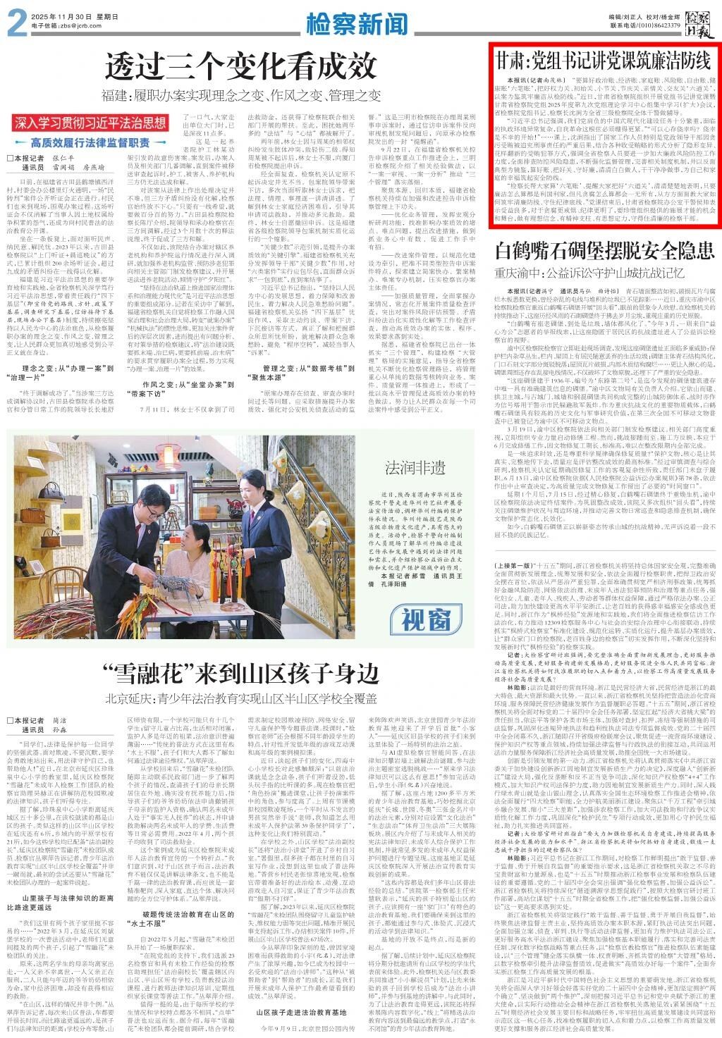 2025年11月30日,检察日报刊发《甘肃:党组书记讲党课筑廉洁防线》。