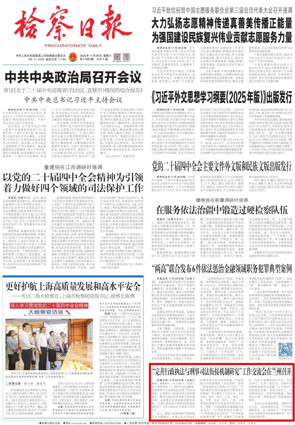 2025年11月29日,检察日报头版刊发《“完善行政执法与刑事司法衔接机制研究”工作交流会在兰州召开》。