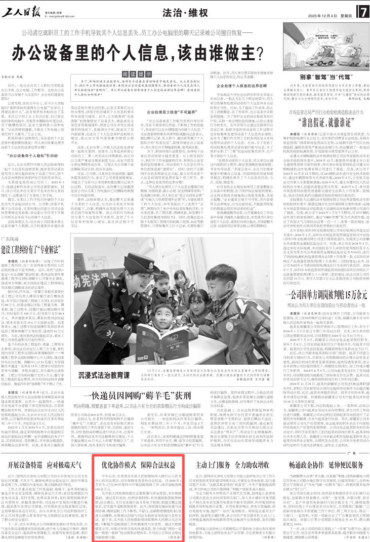 2025年12月4日,工人日报刊发《优化协作模式 保障合法权益》。
