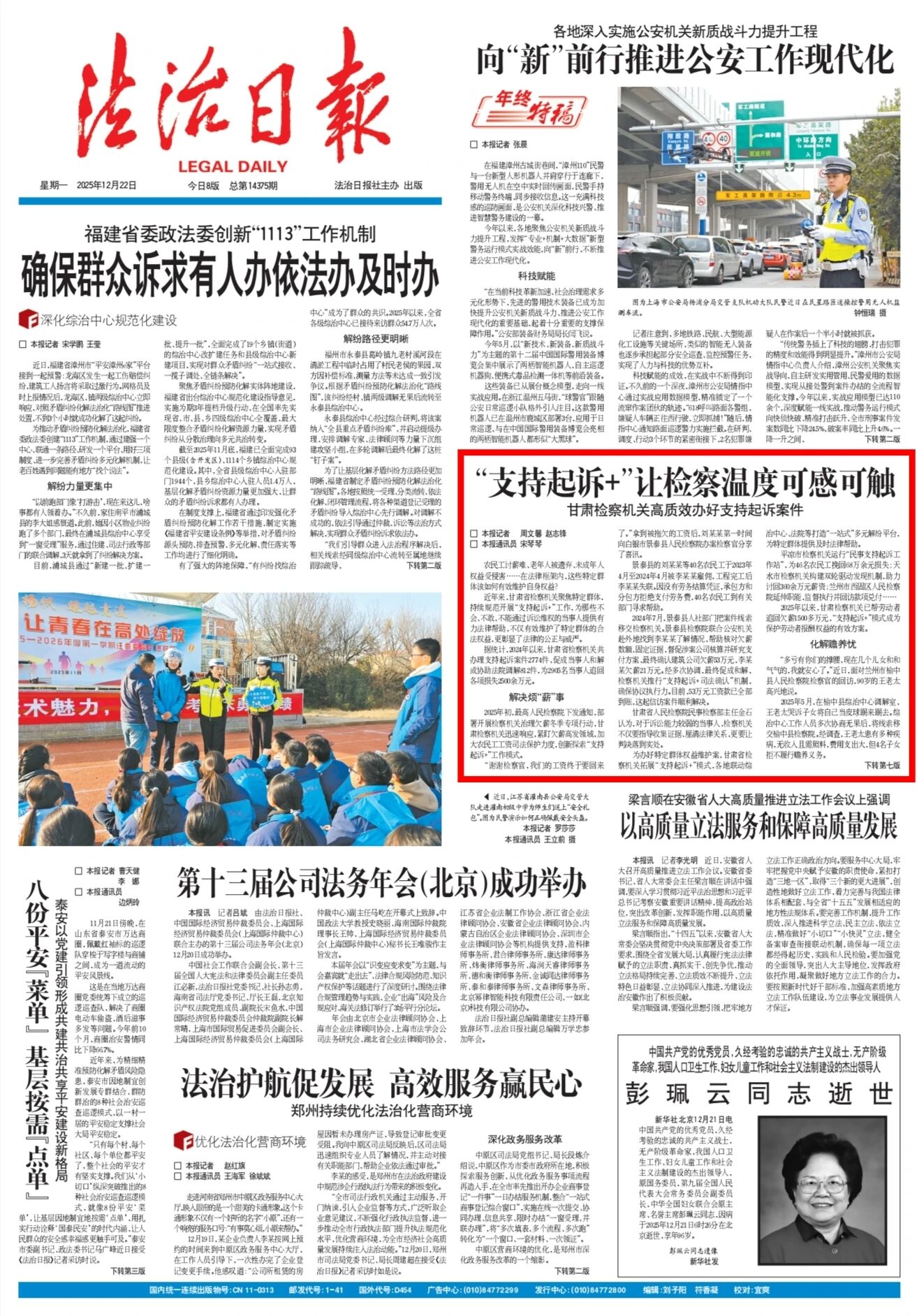 2025年12月22日,法治日报头版刊发《“支持起诉+”让检察温度可感可触——甘肃检察机关高质效办好支持起诉案件》。