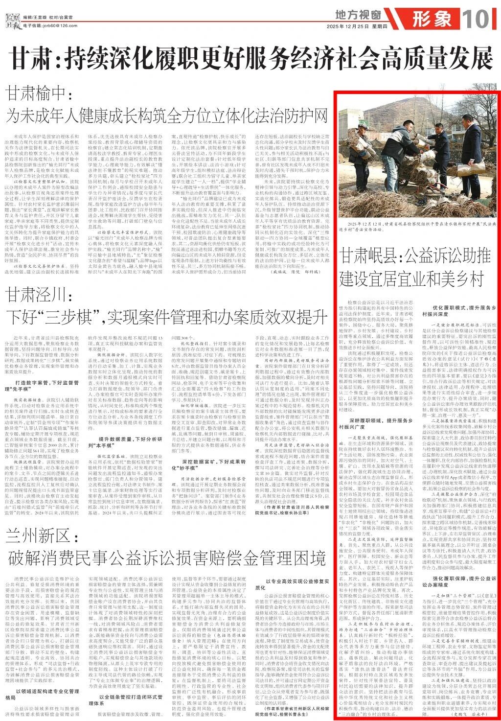 2025年12月25日,检察日报地方视窗《甘肃:持续深化履职更好服务经济社会高质量发展》专版刊发《甘肃岷县:公益诉讼助推建设宜居宜业和美乡村》。