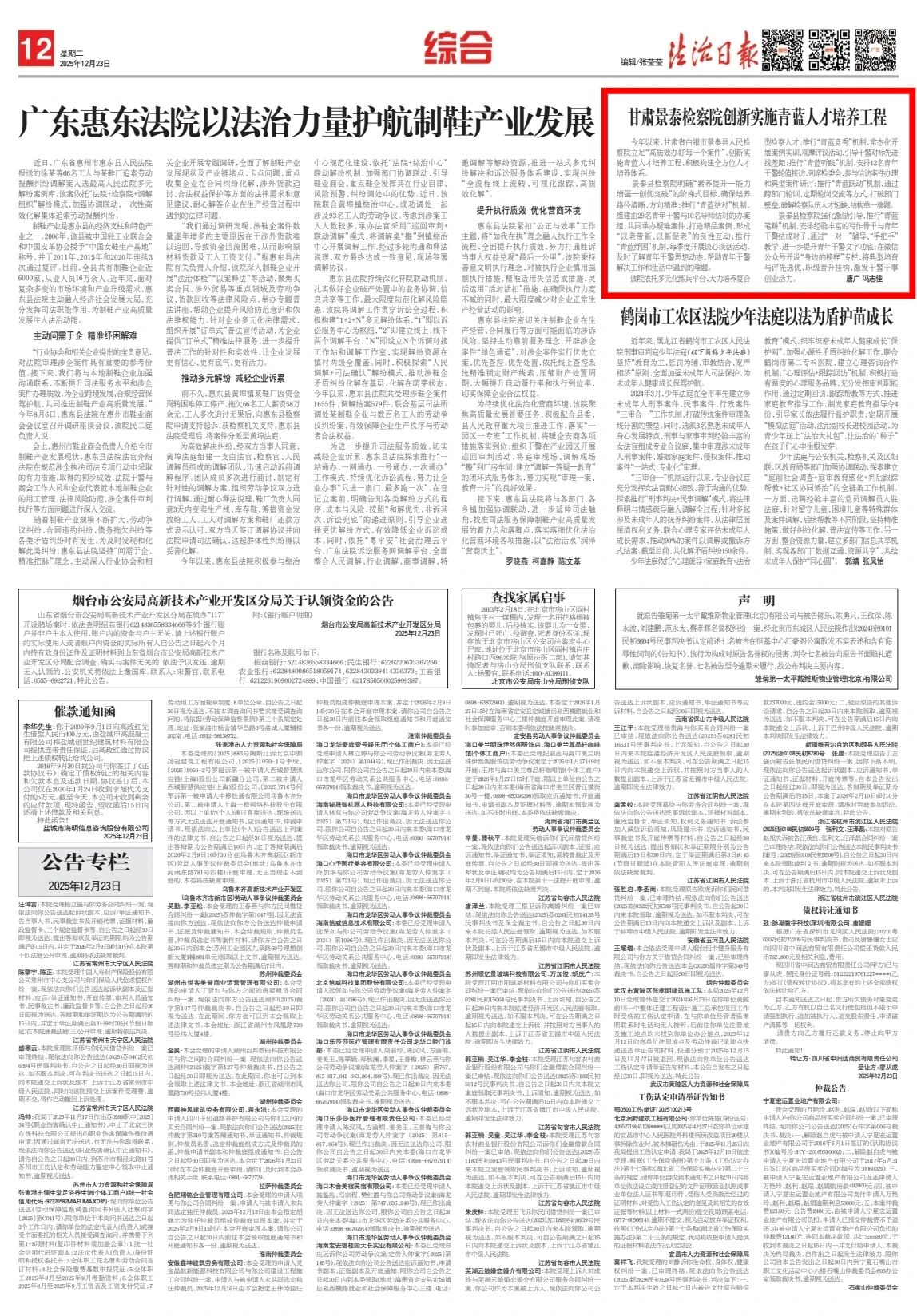 2025年12月23日,法治日报刊发《甘肃景泰检察院创新实施青蓝人才培养工程》。