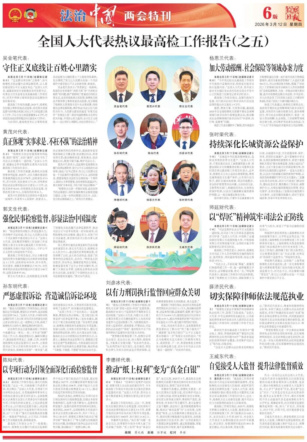 2026年3月12日,检察日报《法治中国两会特刊》专栏刊发《陈灿代表:以专项行动为引领全面深化行政检察监督》。
